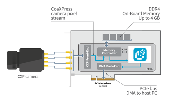 在Coaxlink FPGA內(nèi)部,所有數(shù)據(jù)流接口都基于AMDA AX14流協(xié)議。在源端,用戶邏輯接收從CXP相機(jī)獲取到的圖像,在目標(biāo)端,數(shù)據(jù)流接口將由用戶邏輯生成的結(jié)果圖像或數(shù)據(jù)傳輸?shù)絇CI Express DMA后端通道,DMA傳輸系統(tǒng)可以直接將數(shù)據(jù)在外設(shè)和內(nèi)存之間進(jìn)行高速傳輸,節(jié)省CPU的占用,從而使圖像處理獲得更多計(jì)算資源。此外,多達(dá)4G的DDR4板載內(nèi)存也可以用于存儲(chǔ)中間數(shù)據(jù)和系數(shù)。