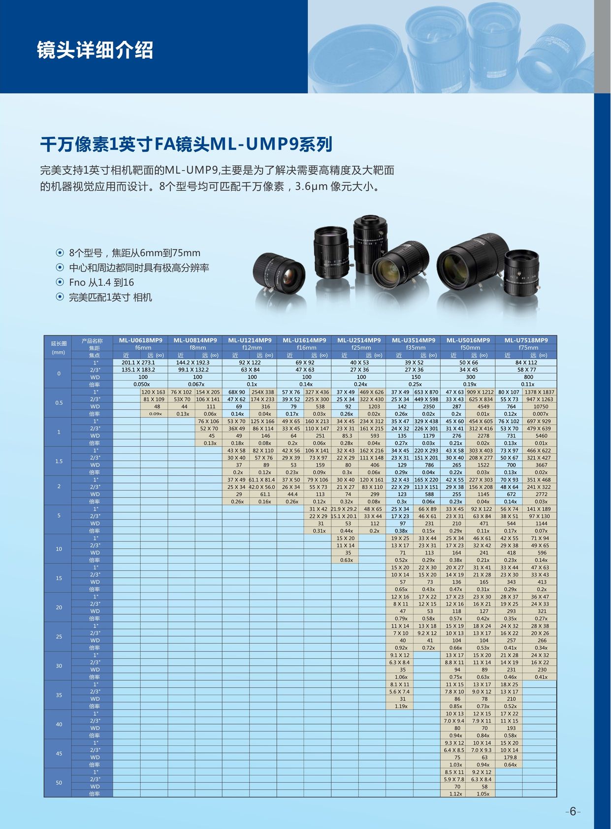 完美支持1英寸相機靶面的ML-UMP9,主要是為了解決需要高精度及大靶面的機器視覺應用而設計。8個型號均可匹配千萬像素,3.6μm 像元大小。